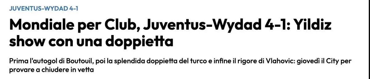 Sport Mediaset: “Kenan Yıldız’ın yıldızı Amerika’da parlıyor: Dünya Kupası’nın yüzü o. Kenan Yıldız iki maçta mutlak bir kahraman olarak sahnenin merkezinde yer aldı. 2005 doğumlu oyuncu, Al Ain’e karşı attığı olağanüstü golü Wydad Casablanca’ya karşı gösterdiği muhteşem performansla tekrarladı ve Juventus’u son 16’ya taşıdı. Türk şu anda bu Kulüpler Dünya Kupası’nın yüzü, golleri ve sıra dışı oyunlarıyla itici bir güç.”